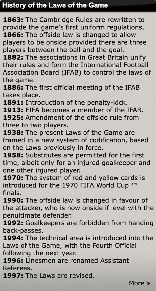 1863年,第一部足球通用规则在伦敦制定。1886年6月2日,为维护足球规则的统一,解决各协会间足球规则的冲突,国际足球协会理事会(IFAB)正式成立。