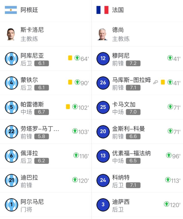 2022年世界杯决赛,法国队完成7次换人,其中41分钟的两次换人、71分钟的两次换人以及113分钟的换人使用的是标准的3次5换,第96分钟优素福-福法纳换下拉比奥使用的是脑震荡协议换人,第120分钟迪萨西换下孔德使用的则是加时赛附加换人。