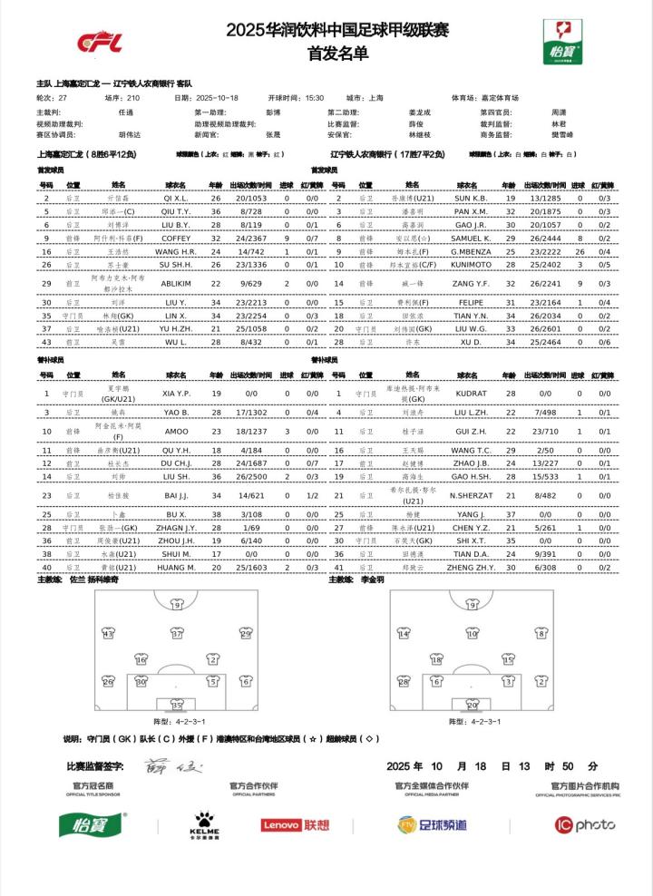 北京时间10月18日15:30,中甲联赛第27轮,辽宁铁人客场对阵上海嘉定汇龙,赛前双方公布首发:
